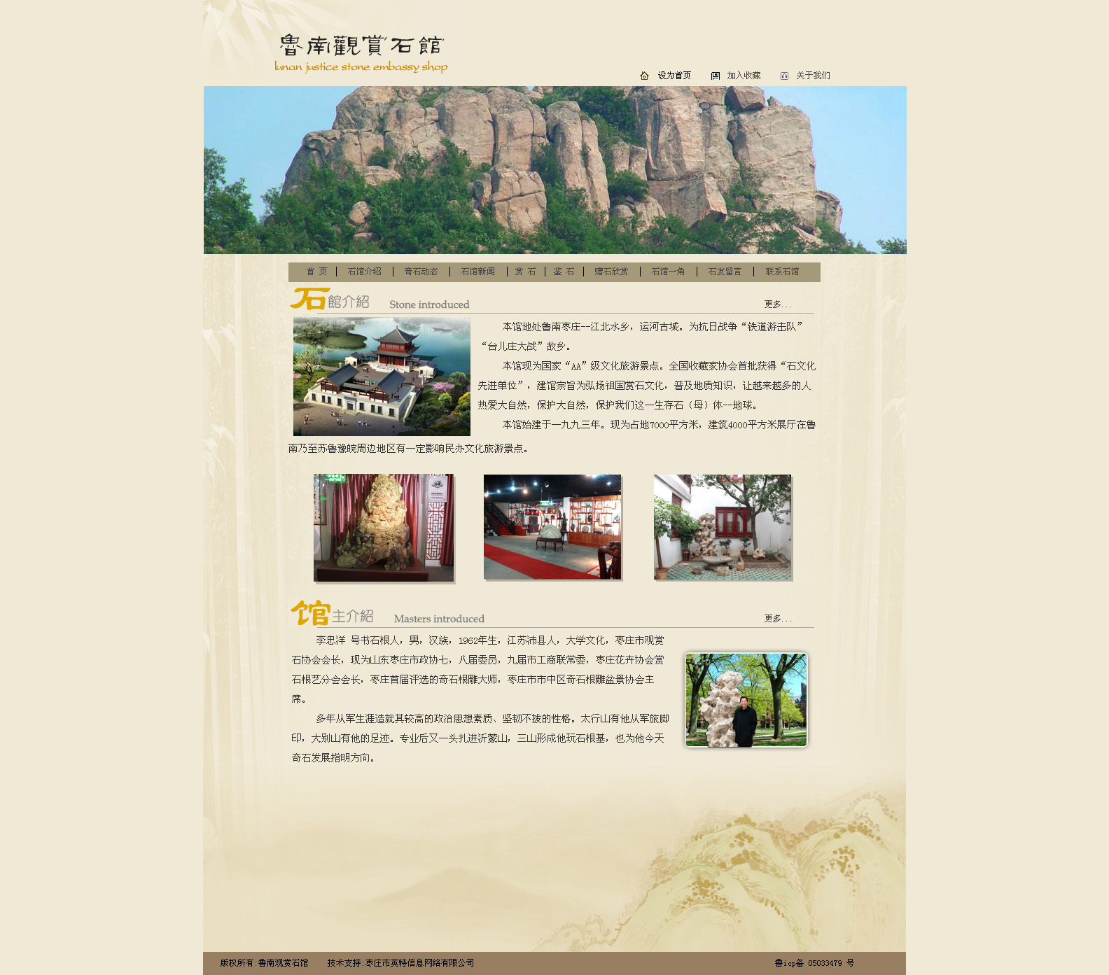 本館地處魯南棗莊--江北水鄉,運河古城。為抗日戰爭“鐵道游擊隊”“臺兒莊大戰”故鄉。 本館現為國家“AA”級文化旅游景點。全國收藏家協會首批獲得“石文化先進單位”,建館宗旨為弘揚祖國賞石文化,普及地質知識,讓越來越多的人熱愛大自然,保護大自然,保護我們這一生存石(母)體--地球。