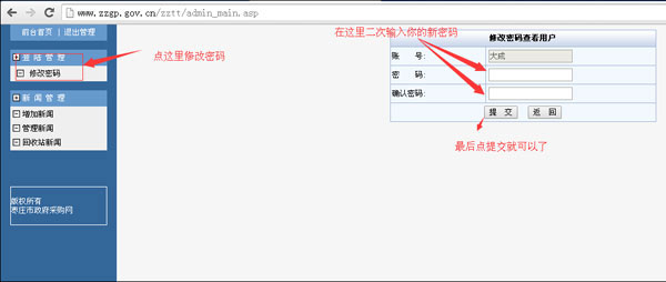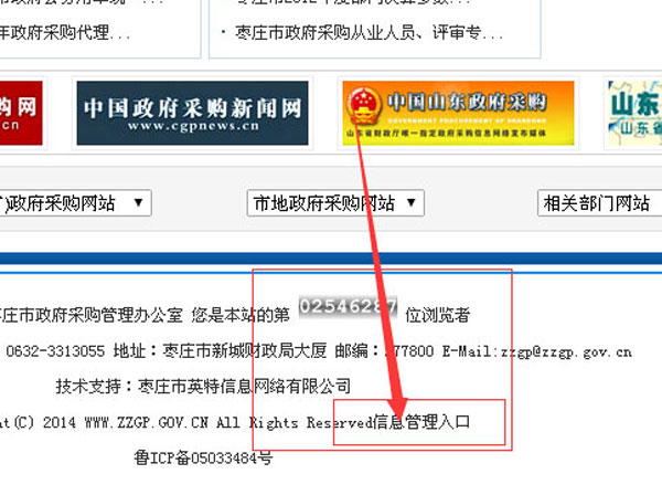 拉到網站的底部,找到信息管理入口點擊進入;蛑苯哟蜷_:http://www.zzgp.gov.cn/zztt/這個地址就可以進入后臺