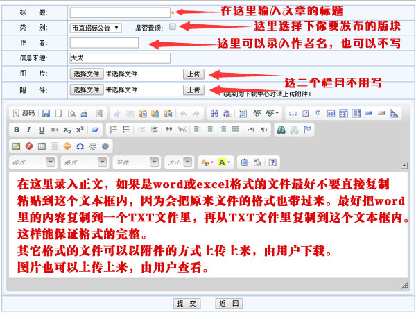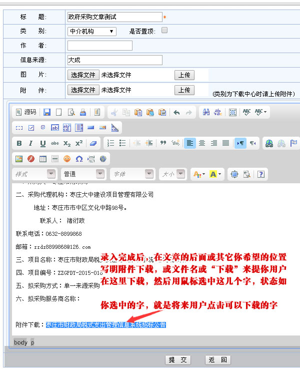 根據上圖完成編輯后,直接可以把各種文檔以附件方式上傳,以方便用戶下載瀏覽。就能完成文章的發布。下面說下附件的上傳辦法。