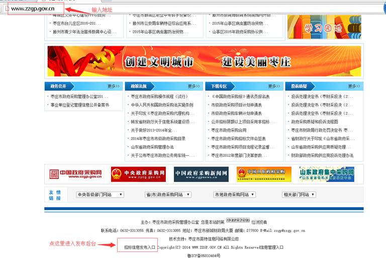 1、 登陸棗莊市政府采購網地址:http://www.zzgp.gov.cn/ 拉到網頁最下邊: