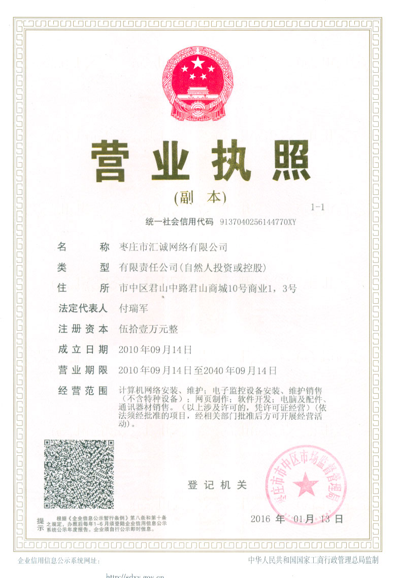 特提供三證合一后的新營業執照副本如下   棗莊市匯誠網絡有限公司營業執照(統一社會信用代碼:9137040256144770XY)